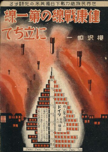 桜沢如一『健康戦線の第一線に立ちて』は昭和16年6月、滋賀・大津の無双原理講究所発行。表紙の人口グラフが戦火の炎のやうに見える。 桜沢は心身の健康がいかに大切さを力説する。健康でなければ、戦争にも負けてしまふ。病気のことを、「姿なき殺人魔」…